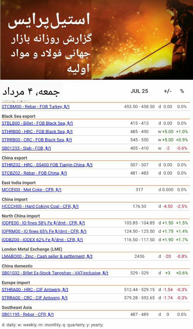 قیمت سنگ آهن ۶۲ درصد در چین در روز پنج شنبه با ۱.۹ دلار افزایش ۱۱۷ دلار معامله شد.