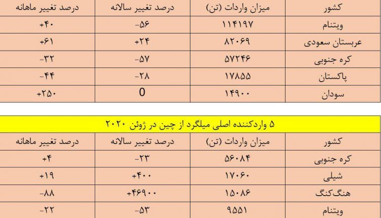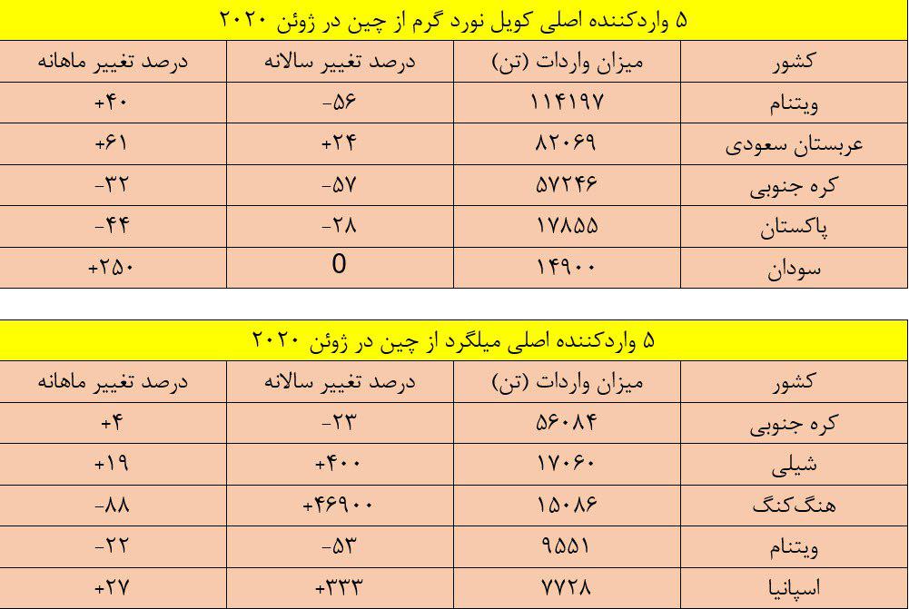 همچنین صادرات مقاطع فولادی و آهن نبشی چین در ماه ژوئن ۲۰۲۰ با ۳۸٫۲ درصد کاهش سالانه و ۱۰ افت ماهانه به ۱۸۰ هزار تن رسید. صادرات میلگرد کلاف نیز در ماه مذکور با ۷٫۸ درصد افت سالانه و ۵٫۹ درصد کاهش ماهانه به ۱۶۰ هزار تن رسید.