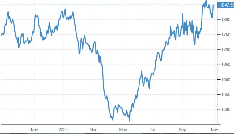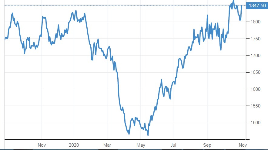 اگر به قیمت این فلز نقره ای رنگ طی بازه ی ۵ ماهه یعنی از ژوئن تا اکتبر۲۰۲۰ نگاهی بیندازیم روند صعودی بلند مدت و در واقع اصلاح قیمتی کاملا آشکار بوده به گونه ای که نه تنها ریزش قیمتی جبران شده بلکه به بالاترین حد قیمتی خود طی یکسال اخیر یعنی بالای ۱۸۲۵ دلار و معادل ۱۸۴۷ دلار طی روزهای اخیر در ماه اکتبر افزایش داشته است.