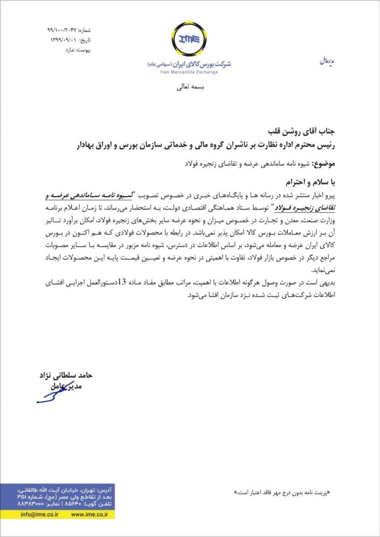 گفتنی است «شـیوهنامـه ساماندهی عرضه و تقاضای زنجیـره فـولاد» که نمایندگان مجلس، فعالان بازار سرمایه و تولیدکنندگان فولاد قبلا مخالفت خود با آن را اعلام کرده بودند، سرشار از ابهامات و تناقضات اساسی و اجرایی و البته امضاهای طلایی فراوان است. ارزان فروشی دستوری فولاد در بورس کالا که از مفاد این شیوه نامه استنباط میشود، قبلا در سال ۹۷ هم تجربه شده و بیش از ۵۰ روز دوام نداشته و پروندههای موسوم به “مابهالتفاوت” هنوز در شرکتها باز است. با وجود ابهامات پیرامون شیوهنامه ابلاغشده توسط معاون اقتصادی رئیس جمهور، بورس کالا علام کرده است که این شیوهنامه «تفاوت با اهمیتی» در عرضه و تعیین قیمت پایه محصولات فولادی ایجاد نمیکند.