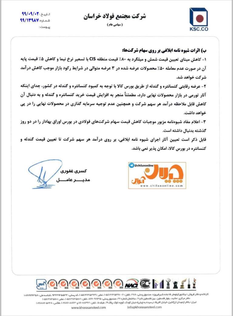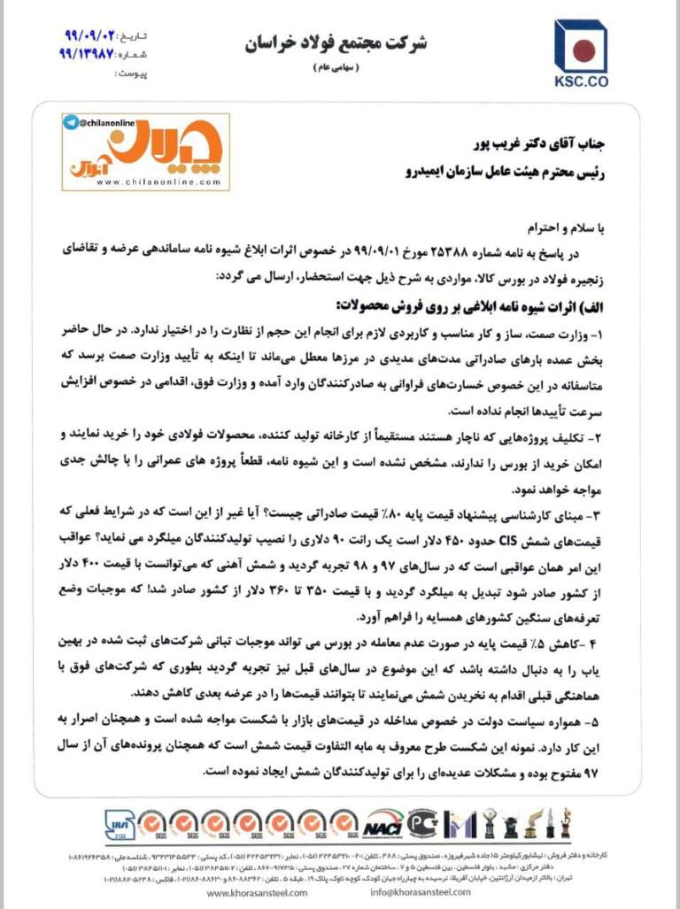 شرکت فولاد خراسان (نماد بورسی فخاس) در نامه‌ای به مدیرعامل ایمیدرو اثرات مخرب شیوه‌نامه جدید تنظیم بازار فولاد که توسط معاون اقتصادی رئیس جمهور ابلاغ شده است را تشریح کرده است. در این نامه صراحتاً عنوان شده است که اعلام مفاد این شیوه‌نامه باعث کاهش قیمت سهام شرکت‌های فولادی در دو روز اخیر شده است. در این نامه به صراحت به تبعات سیاست‌گذاری دستوری قیمت فولاد و خسارت‌های فراوان واردشده به صادرکنندگان به دلیل معطل ماندن بارهای صادراتی در مرزها و تعلل وزارت صمت اشاره شده است.