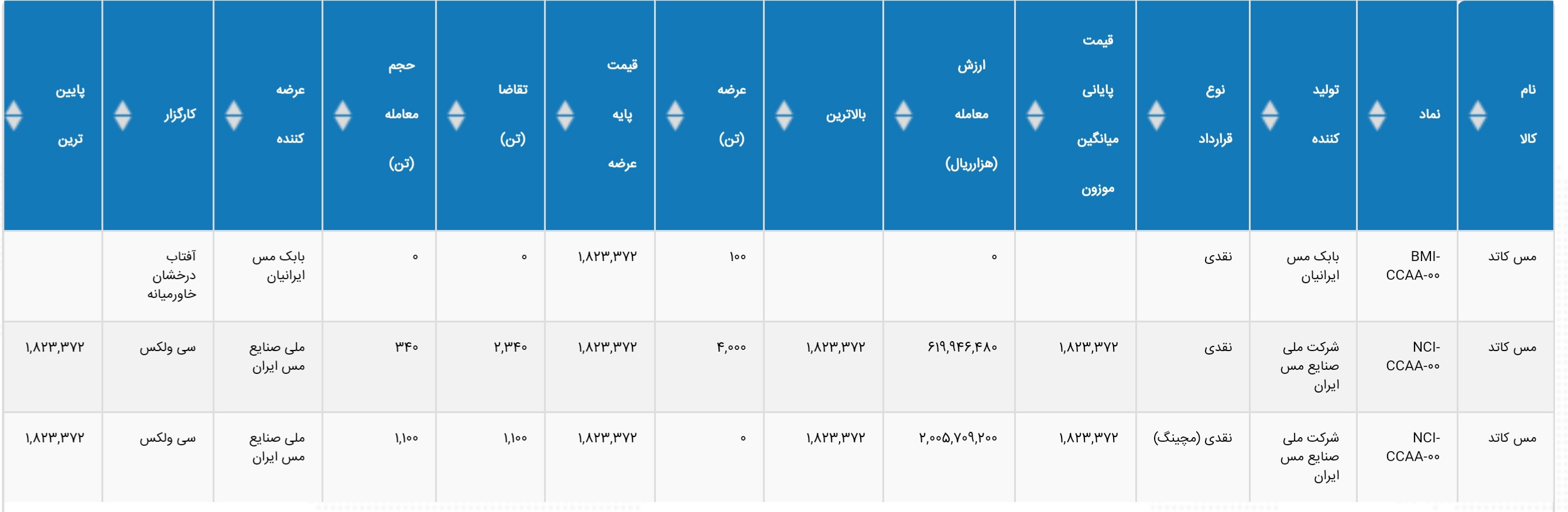 به گزارش معدن ۲۴، روز دوشنبه ۳ آذر ماه، ۴ هزار تن مس کاتد در بورس کالا به قیمت پایه ۱۸۲۳۳۷۲ ریال توسط شرکت ملی مس ایران عرضه و ۳۴۰ تن از آن معامله شد.