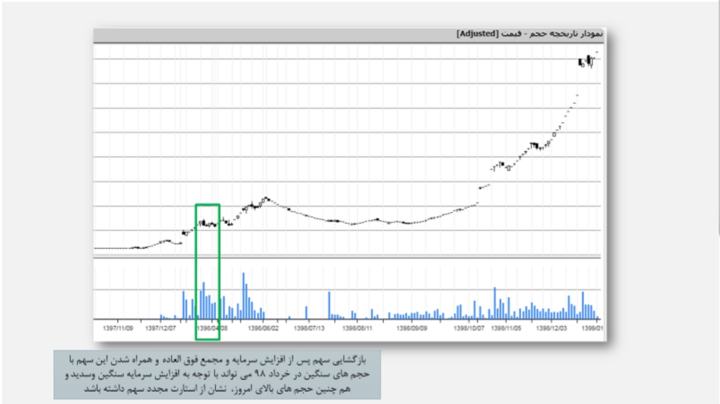 همانگونه که در نمودار بعدی مشاهده میشود، با خبر افزایش سرمایه پیشین و تشکیل مجمع مرتبط، حجم معاملات بشدت صعودی شده و مجدد توانسته است یک الگوی رشد سریع را در این سهم تشکیل دهد و در عرض چند ماه بیش از چند صد درصد بازدهی را ثبت نماید؛ به طوری که در بین برترین سهم‌های بازار به لحاظ بازدهی قرار می‌گیرد. در واقع به نوعی مشابه نمودار قبل و طی بررسی روند سهم، می‌توان به این الگو نیز اشاره کرد که خبر افزایش سرمایه و حجم بالای معاملات به صورت همزمان یک نشانگر جهت ورود سهم به فاز رشد سریع و شارپ بوده است.