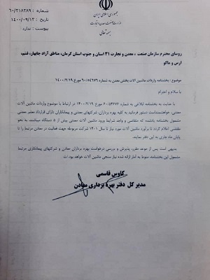 قاسمی در این نامه تاکید کرده است که پس از موعد مقرر، پذیرش و بررسی درخواست بهره برداران معادن و شرکتهای پیمانکاری مرتبط مسمول این بخشنامه، منوط به آمار ارائه شده نیازسنجی ماشینالات خواهد بود.