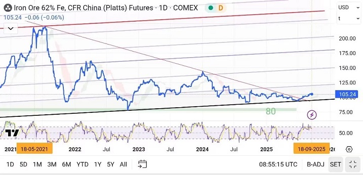 معدن۲۴: قیمت هر تن سنگآهن ۶۲ درصد تحویل چین با رشد مختصر به ۱۰۶ دلار در تن رسید. این رقم اگرچه تغییر قیمتی کمی را نشان میدهد، اما از منظر تکنیکال میتواند نقطه عطفی مهم در پایان روند نزولی ۳ ساله بازار فلز پایه محسوب شود.