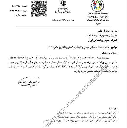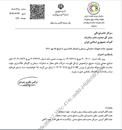 معدن۲۴: سازمان توسعه تجارت ایران طی نامهای فوری به گمرک جمهوری اسلامی، اعلام کرد ۶۷ شرکت تولیدکننده و صادرکننده سیمان و کلینکر خاکستری مجاز هستند تا تاریخ ۱۵ مهر ۱۴۰۴، بدون نیاز به ارائه گواهی خرید از رینگ صادراتی بورس کالا، محصولات خود را صادر کنند.