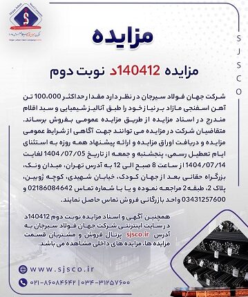 همچنین آگهی و اسناد مزایده نوبت دوم ۱۴۰۴۱۲د در سایت اینترنتی شرکت جهان فولاد سیرجان به آدرس sjsco.ir پرتال فروش و مشتریان قسمت مزایده ها، مزایده های داخلی مشاهده می باشد.