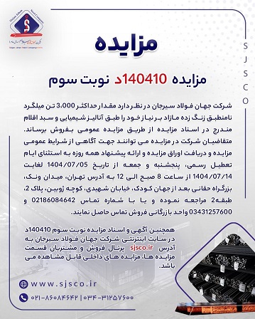 همچنین آگهی و اسناد مزایده نوبت سوم ۱۴۰۴۱۰د در سایت اینترنتی شرکت جهان فولاد سیرجان به آدرس sjsco.ir پرتال فروش و مشتریان، قسمت مزایده ها، مزایده های داخلی قابل مشاهده می باشد.