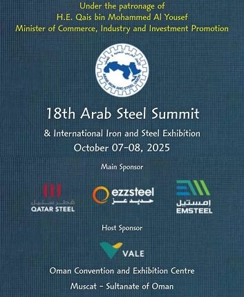 معدن۲۴: هجدهمین نشست آهن و فولاد عمان (18th Arab Steel Summit) به همراه نمایشگاه بینالمللی در تاریخ ۱۵ و ۱۶ مهرماه ۱۴۰۴ (۷ و ۸ اکتبر ۲۰۲۵) در مرکز همایشها و نمایشگاههای عمان (Oman Convention and Exhibition Centre) واقع در شهر مسقط، پایتخت سلطنت عمان برگزار میشود.
