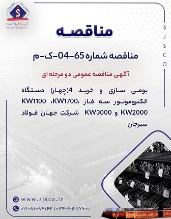 آگهی مناقصه عمومی دو مرحله ای ” بومی سازی و خرید ۴ (چهار) دستگاه الکتروموتور سه فاز 1100KW ،1700KW، 2000KW و 3000KW شرکت جهان فولاد سیرجان”