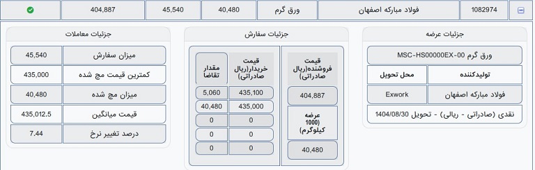 برپایه این گزارش، میزان سفارش این محصول ۴۵ هزار و ۵۴۰ تن، کمترین قیمت مچ شده ۴۳۵ هزار ریال، میزان مچ شده ۴۰ هزار و ۴۸۰، قیمت میانگین ۴۳۵ هزار و ۱۲ ریال و درصد نرخ تغییر ۷.۴۴ درصد بوده است.