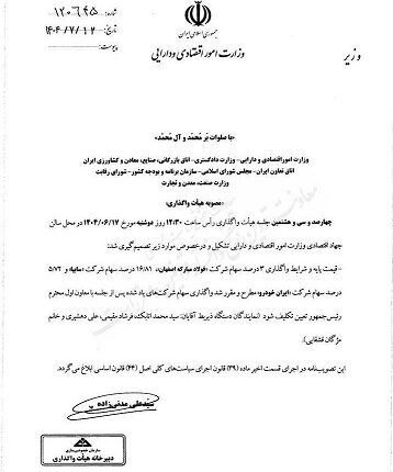 همچنین درباره قیمت پایه و شریط واگذاری شرکت‌های « فولاد مبارکه اصفهان، سایپا و ایران خودرو» تصمیم‌گیری شد.