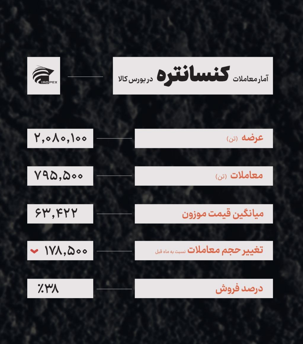 در ماهی که گذشت ۲ میلیون و ۸۰ هزار و ۱۰۰ تن کنسانتره در بورس کالا عرضه و ۷۹۵ هزار و ۵۰۰ تن آن معامله شد.