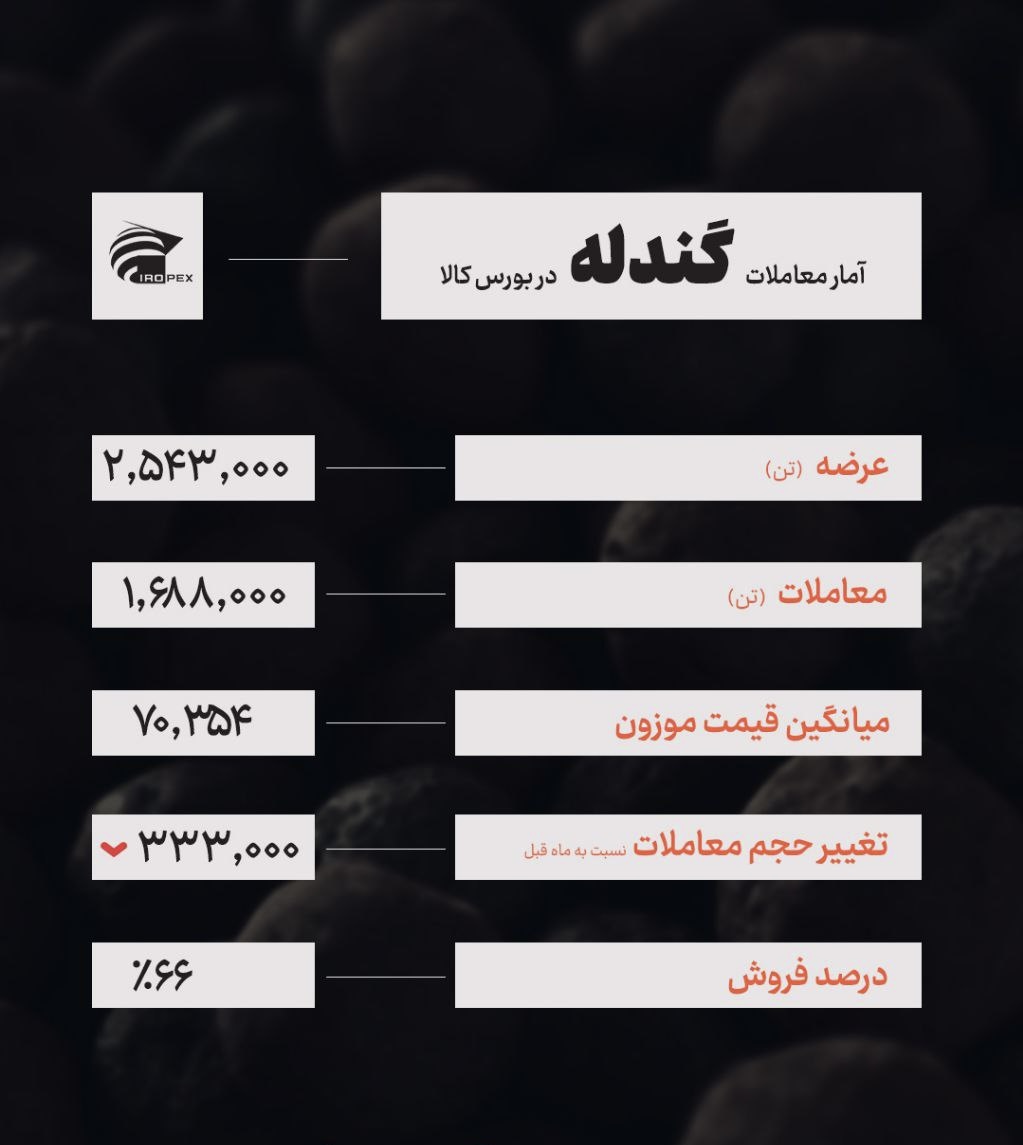 در این مدت ۲ میلیون و ۵۴۳ هزار تن گندله در بورس کالا عرضه شد که یک میلیون و ۶۸۸ هزار تن از آن با قیمت میانگین موزون ۷۰ هزار و ۳۵۴ تومان به فروش رفت. به عبارتی درصد فروش آن ۶۶ درصد بود.