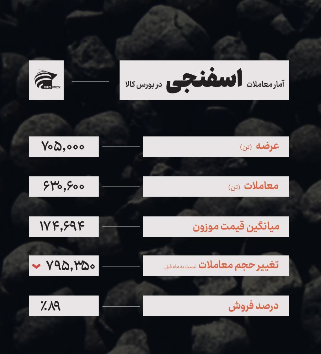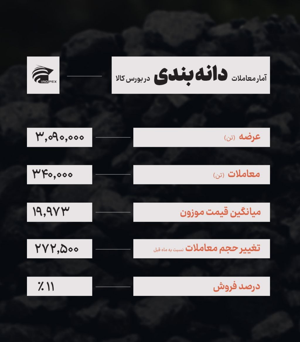 در سنگ آهن دانه بندی نیز شاهد عرضه ۳ میلیون و ۹۰ هزار تن کالا در بورس کالا بودیم که ۳۴۰ هزار تن آن با درصد فروش ۱۱ درصد معامله شد.