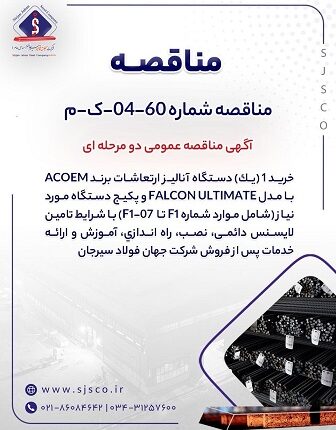 آگهی مناقصه عمومی دو مرحله ای ” خرید ۱ (یک) دستگاه آنالیز ارتعاشات برند ACOEM با مدل FALCON ULTIMATE و پکیج دستگاه مورد نیاز (شامل موارد شماره F1 تا F1-07) با شرایط تامین لایسنس دائمی، نصب، راه اندازی، آموزش و ارائه خدمات پس از فروش شرکت جهان فولاد سیرجان”
