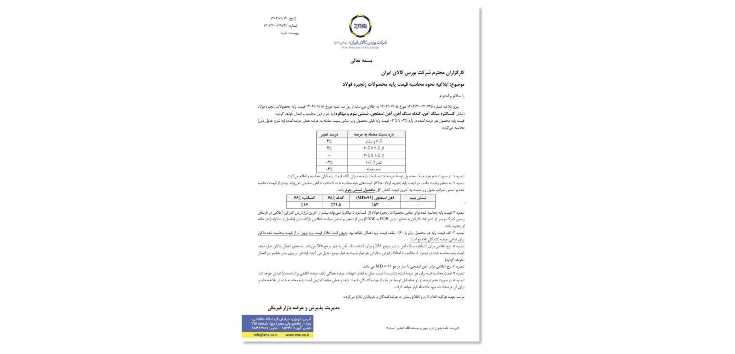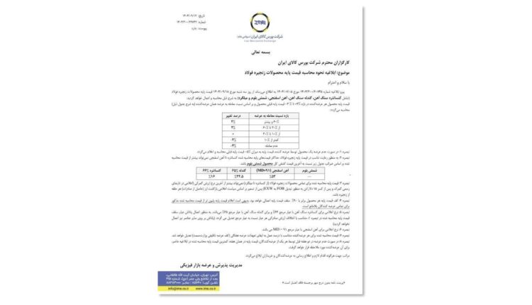 معدن۲۴:بورس کالا در ابلاغیهای جدید، ضمن پذیرش پیشنهاد شورای آهن و فولاد، نحوه محاسبه قیمت پایه زنجیره فولاد را تغییر داد.