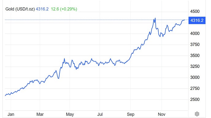 معدن۲۴: قیمت طلا روز چهارشنبه با عبور از ۴ هزار و ۳۲۰ دلار به ازای هر اونس افزایش یافت و به سطوحی نزدیک شد که آخرین بار در ماه اکتبر و در حوالی رکوردهای تاریخی ثبت شده بود. این رشد در شرایطی رقم خورد که سرمایه‌گذاران همچنان احتمال تداوم سیاست‌های انبساطی فدرال رزرو در سال آینده را بالا ارزیابی می‌کنند.