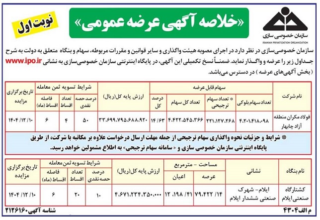 معدن۲۴: سازمان خصوصی‌سازی در نظر دارد در اجرای مصوبه هیات واگذاری و سایر قوانین و مقررات مربوطه، نسبت به عرضه و واگذاری سهام «فولاد مکران منطقه آزاد چابهار» از طریق مزایده عمومی اقدام نماید.