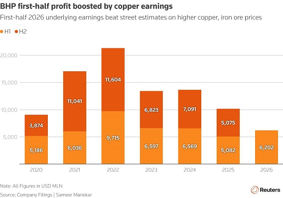 بر اساس گزارش منتشرشده سود BHP در شش‌ماهه منتهی به ۳۱ دسامبر با رشد ۲۲ درصدی به ۶.۲۰ میلیارد دلار رسید. این شرکت همچنین سود نقدی میان‌دوره‌ای ۷۳ سنت به ازای هر سهم اعلام کرد که از پیش‌بینی بازار (حدود ۶۳ سنت) بیشتر بود و نسبت پرداخت را به ۶۰ درصد رساند.