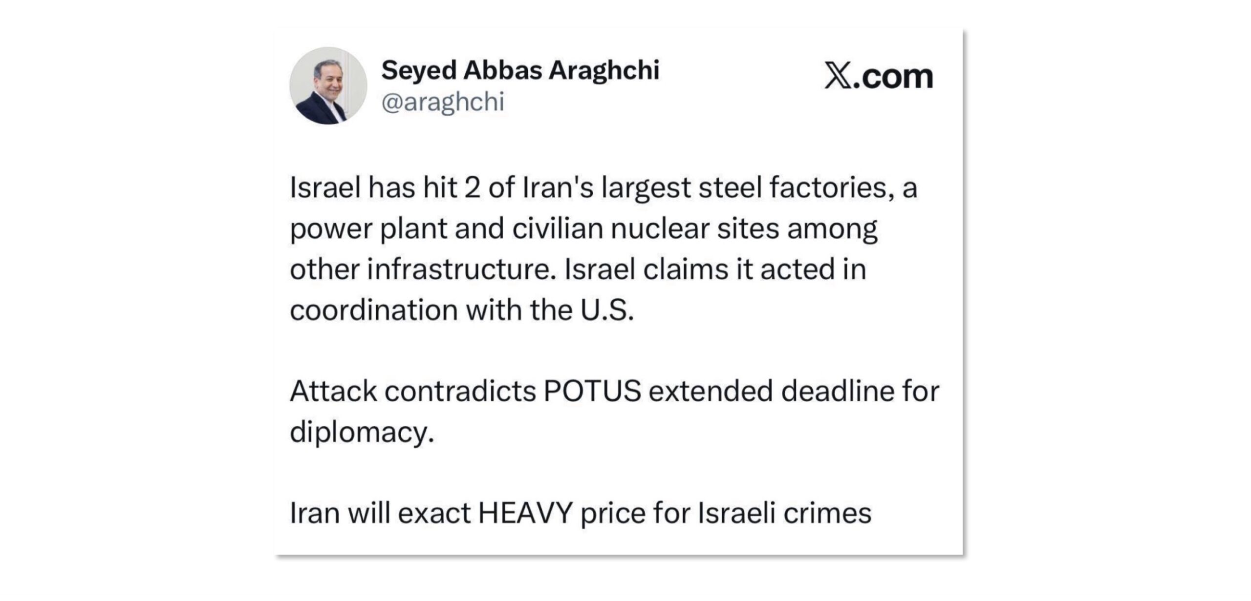 معدن۲۴:عباس عراقچی، وزیر امور خارجه در توییتی نوشت: اسراییل دو مورد از بزرگترین کارخانههای فولاد ایران، یک نیروگاه برق و همچنین سایتهای هستهای غیرنظامی را در کنار سایر زیرساختها هدف قرار داده است.