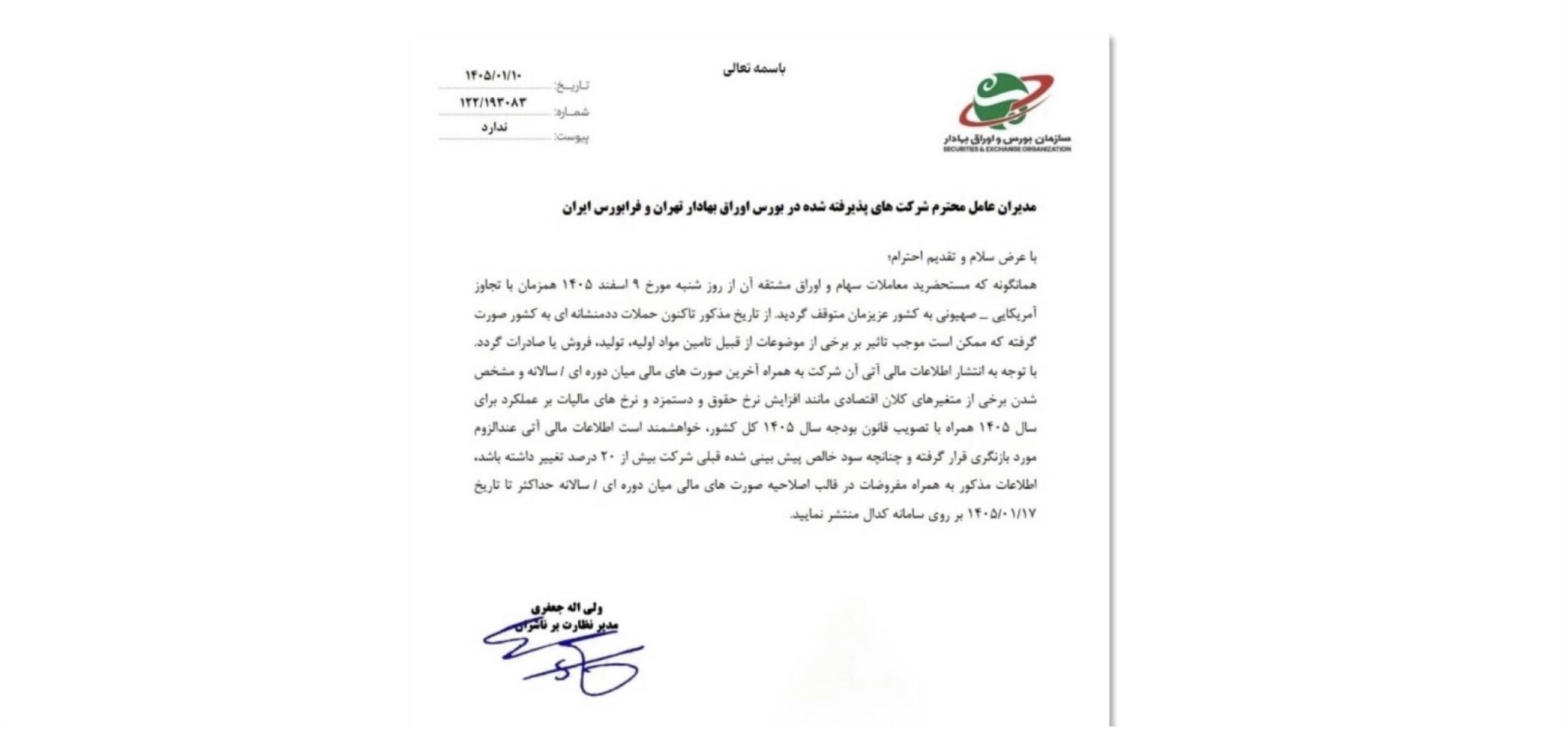 معدن۲۴:ولیاله جعفری، مدیر نظارت بر ناشران سازمان بورس و اوراق بهادار با اشاره به شفاف سازی اخیر سازمان بورس و اوراق بهادار در پی ارائه اطلاعات شرکتها در خصوص بازگشایی نمادها گفت: نامه ارسال شده به شرکتها به مفهوم بازگشایی بازار سهام نیست.