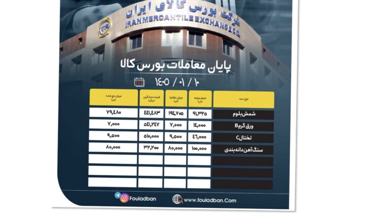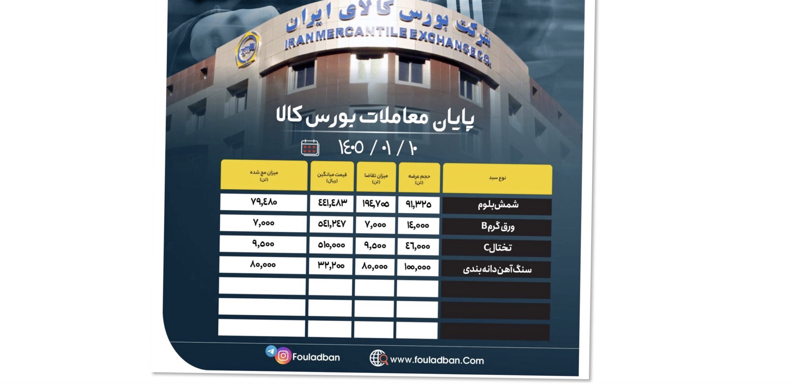 معدن۲۴:دوشنبه ۱۰ فروردین ماه از مجموع ۲۹۳ هزار و ۹۵۰ تن محصول فولادی که قرار بود در تالار حراج باز بورس کالا معامله شود، ۲۵۱ هزار و ۳۲۵ تن روی تابلوی معاملات قرار گرفت که ۱۷۵ هزار و ۹۸۰ تن یعنی حدود ۷۰ درصد از محصولات به فروش رسید.